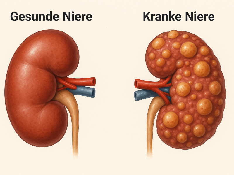 - Polyzystische Nierenerkrankung: Zystenbildung verdrängt und zerstört Nierengewebe